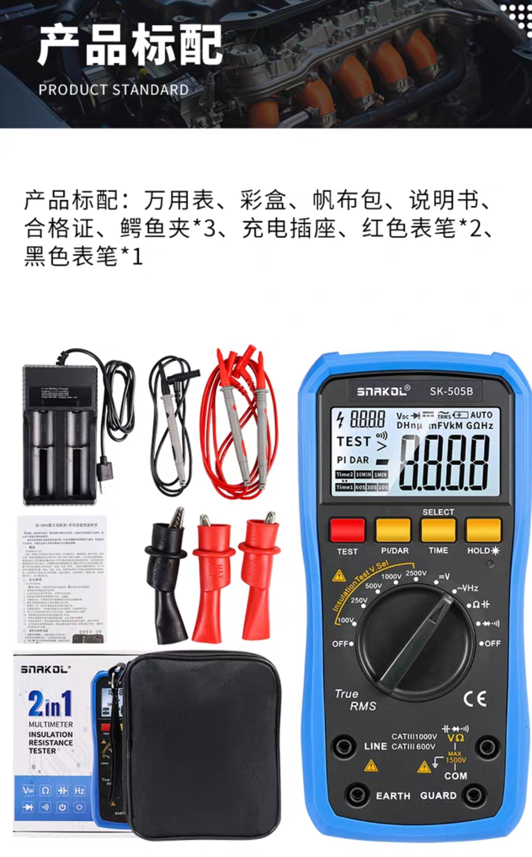 型號(hào):SK-505B;功能參數(shù):額定電壓50v-2500v,測量范圍0.5mΩ-50GΩ,交/直流電壓6v-1500v,通斷蜂鳴,數(shù)據(jù)保持,自動(dòng)關(guān)機(jī),尺寸:189mm*89mm*55mm