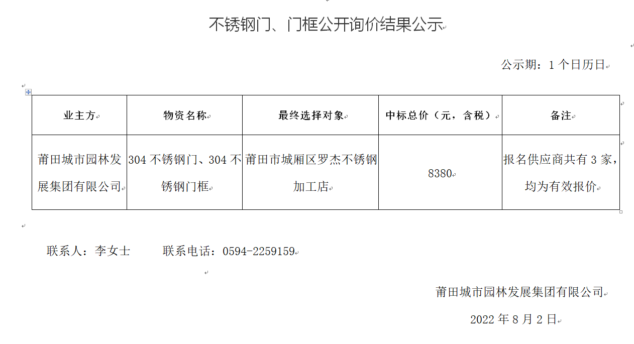不銹鋼門、門框公開詢價結果公示