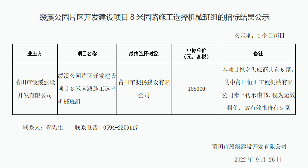綬溪公園片區(qū)開發(fā)建設(shè)項目8米園路施工選擇機械班組的招標結(jié)果公示